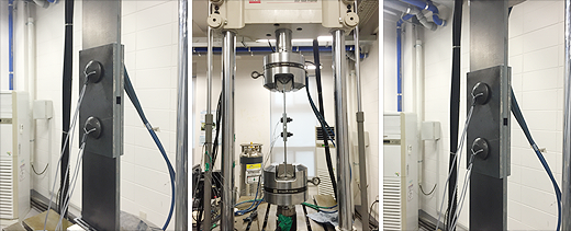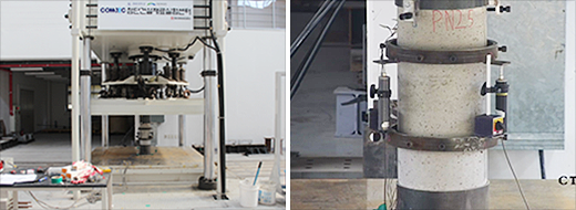 - 250mm×1,000mm 원주형 실험체를 UTM에 설치하여 일축 압축 실험을 수행
