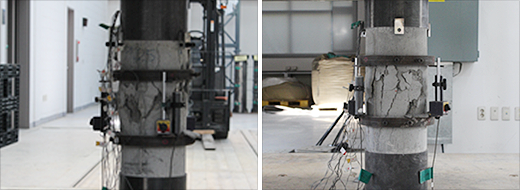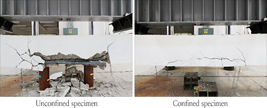 - 실험은 5MN대형부재시험기로 단조 가력하여 수행되었으며, 콘크리트 부재에 매립된 철근에 부착된 변형률 게이지와 실험체 하부에 설치한 변위계로 실험체의 변형률 및 변형을 측정하였음