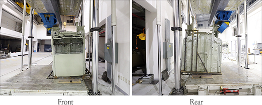 - 실험은 5MN대형부재시험기를 이용하여 small overlap 시험과 동일하게 차량 너비의 25%지점에 하중을 가력할 수 있도록 하였으며, 하중재하속도는 50 mm/min로 하였음